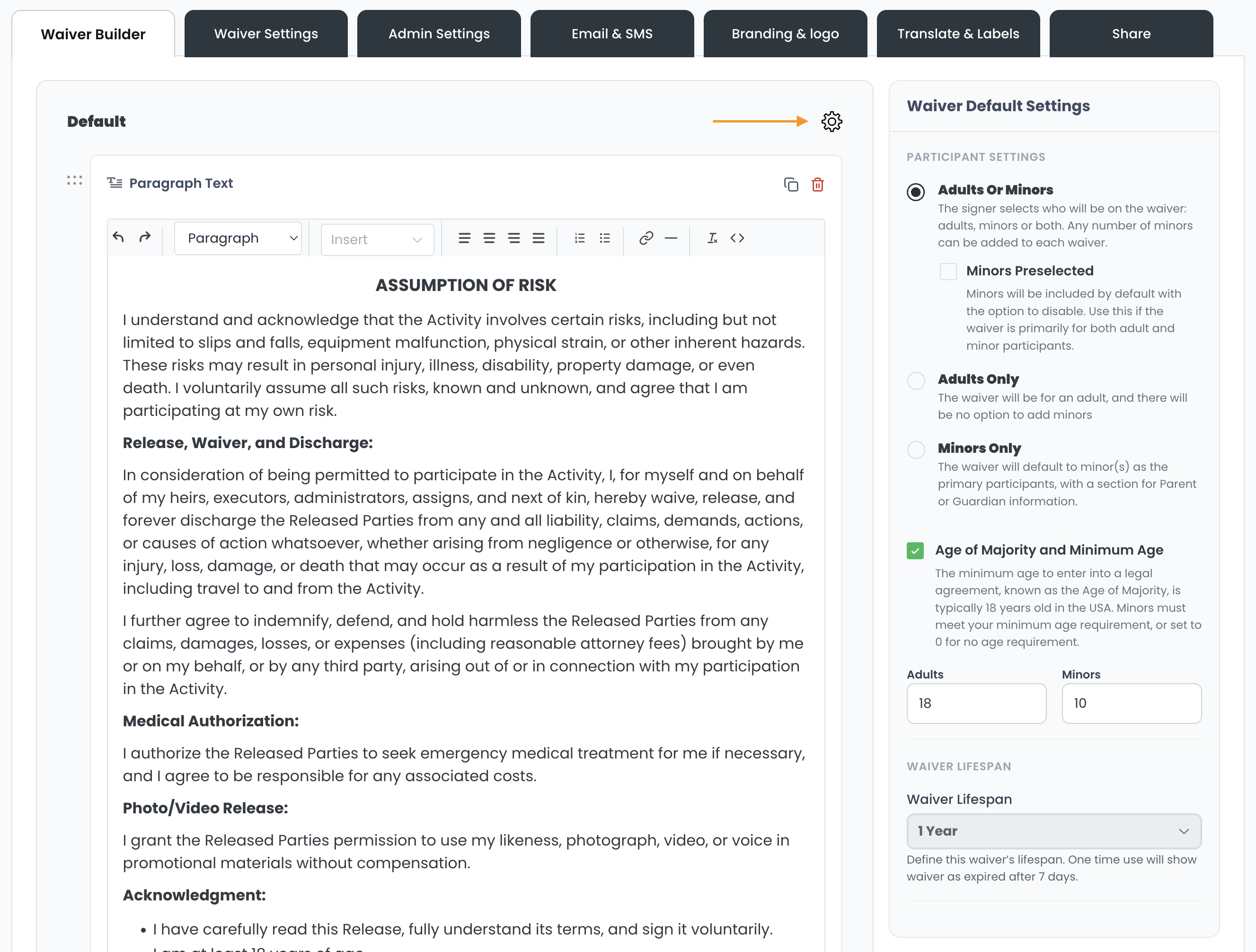 icon at the top of the builder canvas. This will open the default settings for your waiver.